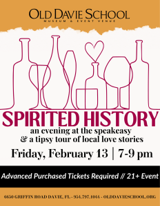 An evening at the Speakeasy! Take a tour and hear the local love stories from Davie’s history. Enjoy libations & relax to the musical stylings of the Moonshyne Players! You’ll need a password to this speakeasy — so get your tickets now! 21+ Event Special Price for Teachers and College Students!! (must show ID)